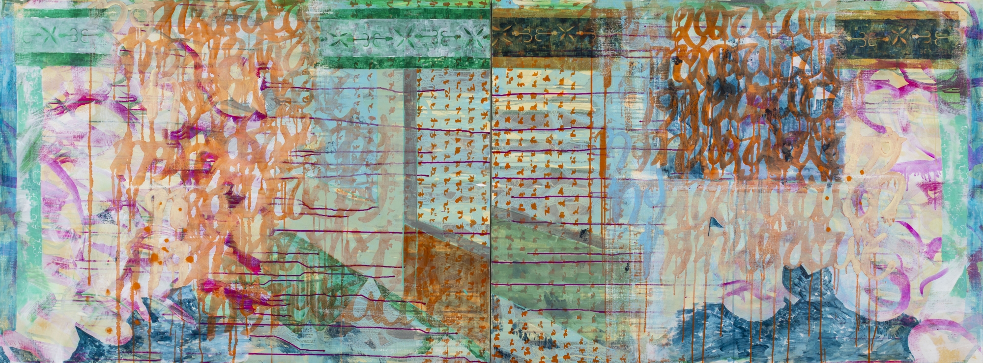 川村摩那は自身で書き綴った詩や散文、日本の近代文学作品などをもとに、文章の中に立ち現れる情景や文字そのものをモチーフにした絵画を制作している。言語というものが世界を知覚する手段でありながら、同時に世界を変容させる力を持つことに関心を寄せ、言葉に依拠しつつも、言葉だけでは捉えきれない感覚や印象を、絵画という視覚表現の中で探求している。キャンバス上に描き重ねられた様々な言葉の形が滲んで崩れ、他の図像と交わっていくことで、言葉というものの移ろいや意味の変容を視覚的に表現している。言葉の物質性と可変性に注目しながら、絵画を通して新たな語りを開くことを目指している。