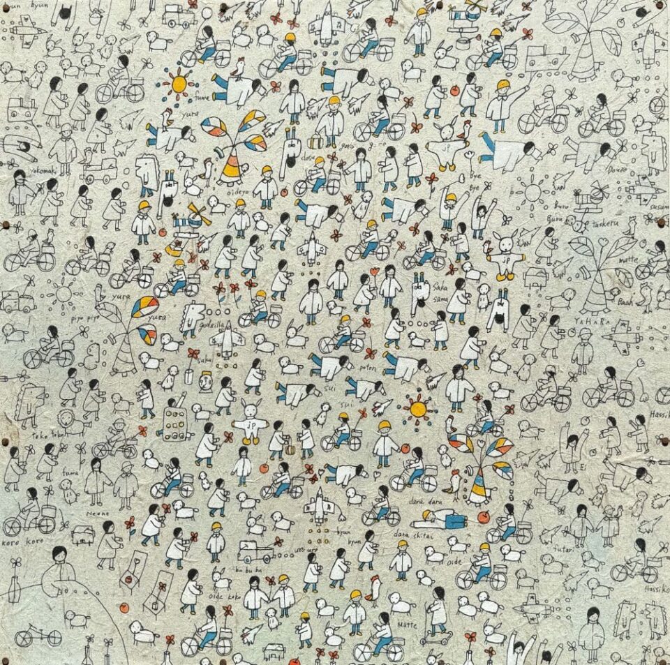 本展の後半で紹介されている〈Family〉シリーズは、矢原自身が「封印を解いてもよい」と感じ始めた近年の心境を反映した作品群です。小さな人物やモチーフが画面いっぱいに描き込まれた作品には、これまで抑制されてきた感情や日常の気配が、軽やかに、しかし確かな密度をもって表現されています。