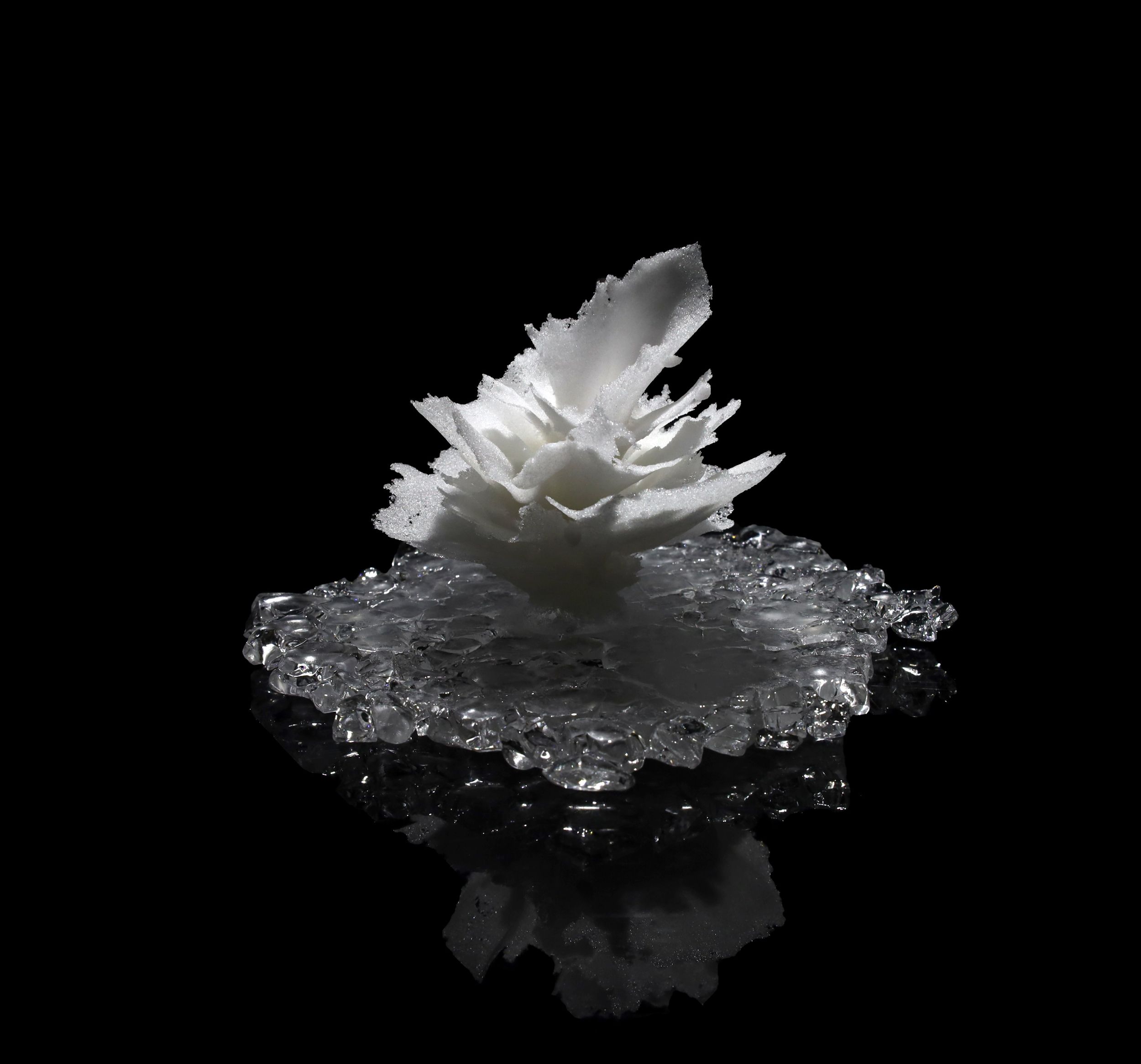 加藤千佳は、水が姿を変える一瞬の現象に静かに眼差しを向け、その儚さと緊張感をガラスという素材に写し取ってきました。日常の中でふと立ち現れては消えていく自然の痕跡。作家はそれらを単なるモチーフとしてではなく、「時間」や「空間」の感触を伴う記憶として捉え、造形へと昇華させています。